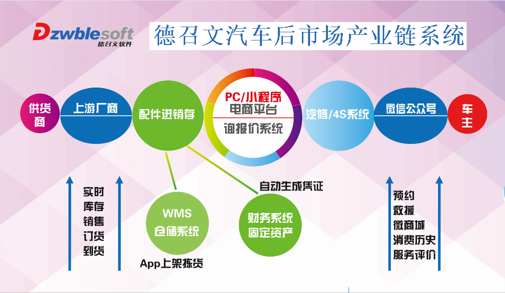 其中德召文【汽配供應(yīng)鏈系統(tǒng)】包括【汽配軟件】+【W(wǎng)MS倉(cāng)儲(chǔ)系統(tǒng)】+【供應(yīng)鏈電商平臺(tái)】+【財(cái)務(wù)軟件】+【固定資產(chǎn)】一體化解決方案